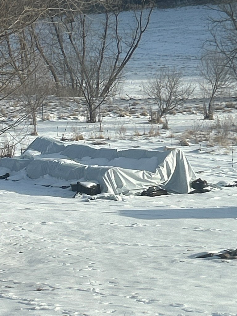 During a snowstorm in late February this overflow hoophouse collapsed, where I also overwinter what’s left. Entirely my fault- I expected the snow to shed as it always had but it went through a melt/freeze rock sold couple of cycles and just gave up. Not a lot of terrible damage except I have to rebuild it!