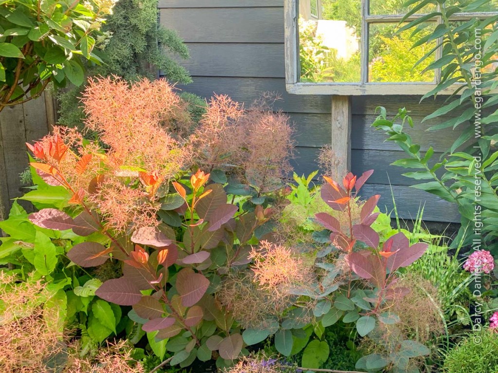Is this a bush? A tree? I’m going to call it a multi stemmed small tree because its actually a cross between American Smoketree and Smokebush, so you get the best of both in Grace. If let to grow unchecked it could get 25′ tall, but you can lop this quite severely and enjoy all the big glaucous purple foliage, but not much of the flowers. And the fall foliage is amazing with gold, copper, and orange.