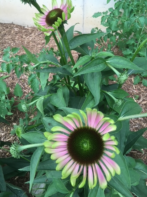 This is one of the recent, very interesting, cultivars of echinacea that is reliably hardy. Lots of flowers, traditional purple in color, the the petals curl up on the sides so that it looks very three dimensional and bicolored. It’s all chartreuse and watermelon pink – very fun.