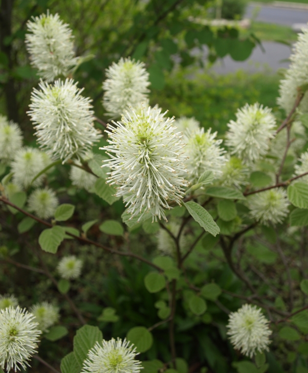 This plant looks good all summer long – from the May blooms that are creamy white and bottle-brushy, greenish blue foliage all summer long, and fall color is really vibrant – mostly orange. This cultivar grows 4-5′ tall. In the coldest areas around here there may be some die back, seems to be zone 4/5, so in rural gardens plant in a more protected area.