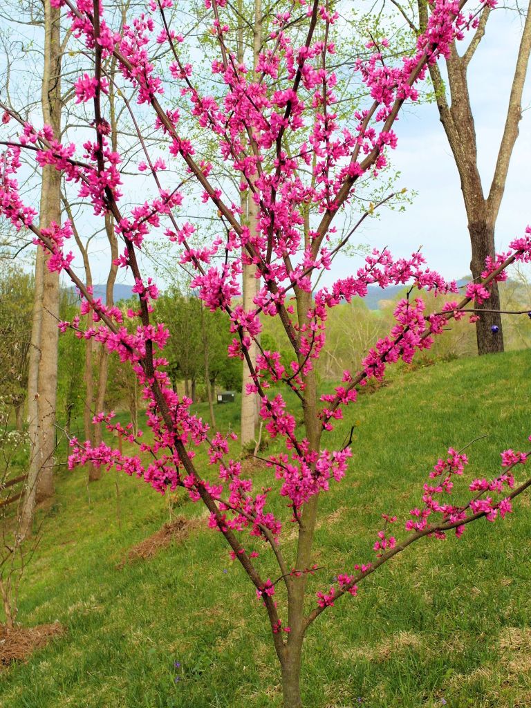 There is no mistaking a redbud for a flowering crab – look how the petals seem to come right out of the branch! This makes me think of how twinkle lights look on a tree when they are carefully and artfully twisted on. And if the twinkle lights were a fantastic iridescent fushcia color!
