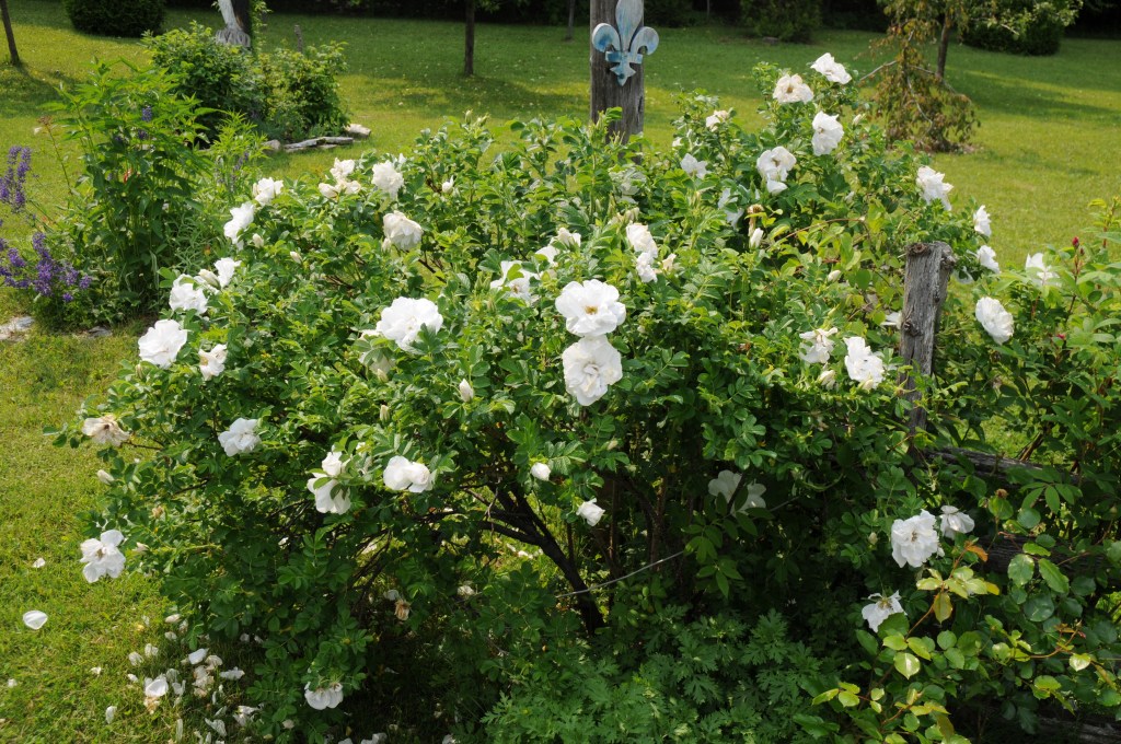 This is a very hardy heirloom rugosa type rose that is from the mid 1800’s. It is said to be one of the purest white, and it is very pretty. I like it for it’s fortitude even when it’s been a hard winter. The foliage is sturdy and it reblooms all summer. It would appreciate a shovel full of compost at the start of the year.